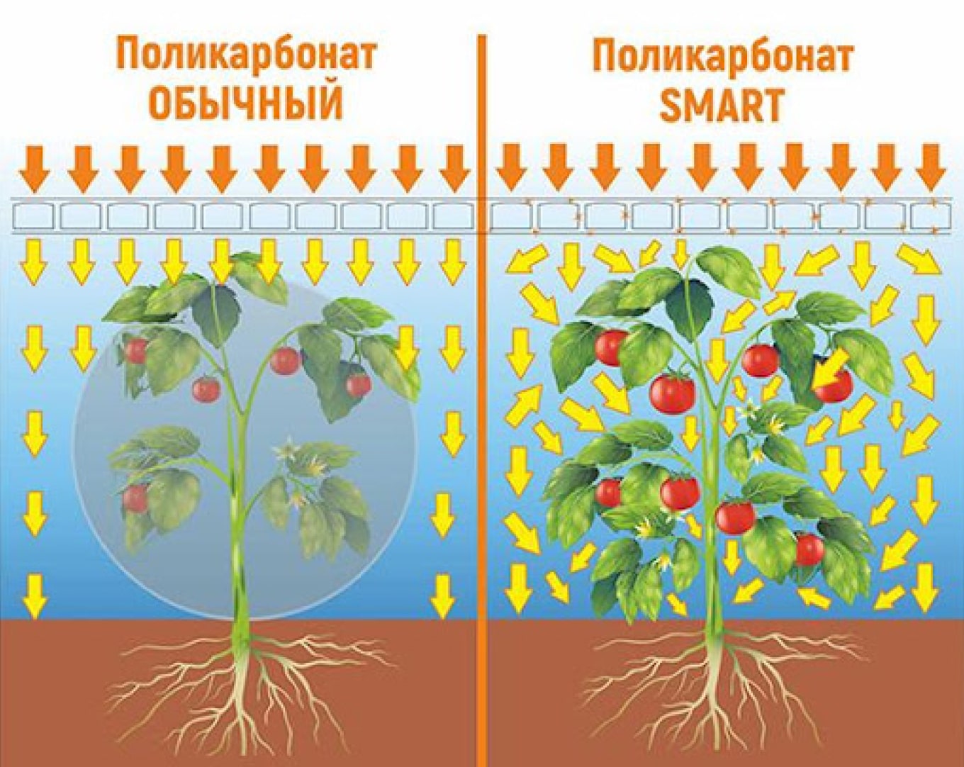 - Улавливая потоки солнечного света УМНЫЙ сотовый поликарбонат SMART подвергает их 100% рассеиванию, что позволяет использовать не только самые полезные волны света, но и равномерно распределять их по всему пространству теплиц.